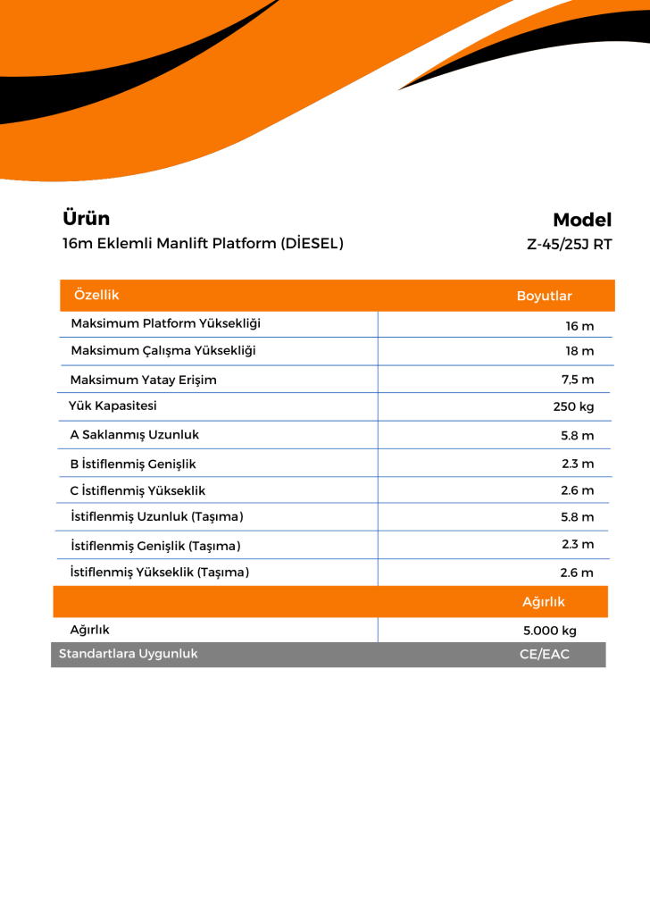 16m Eklemli Manlift Platform Z-45/25J RT (DİESEL)