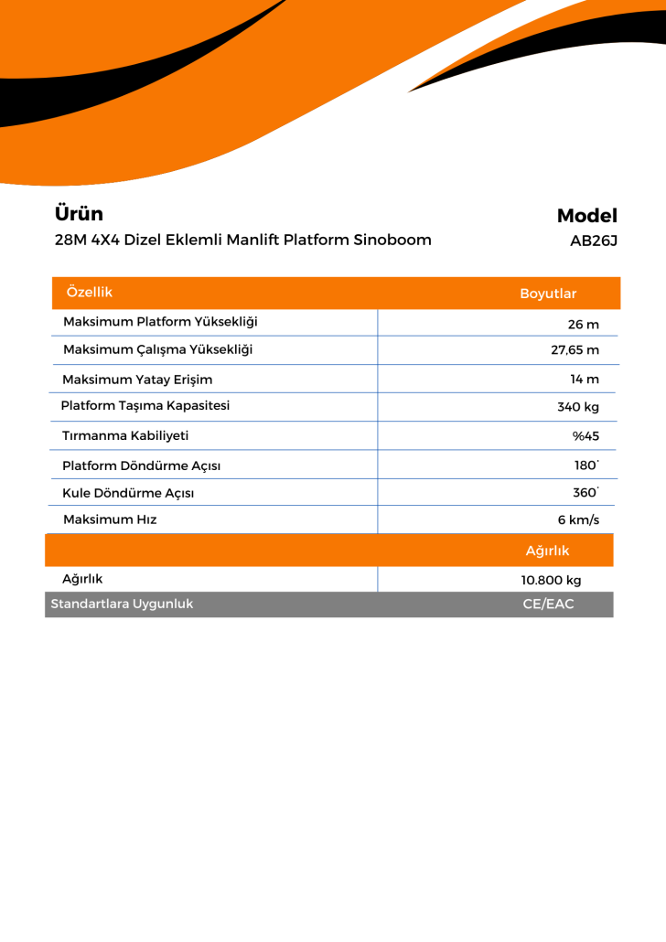 28MT 4×4 Akülü Eklemli Manlift Platform Sinoboom AB26EJ Plus